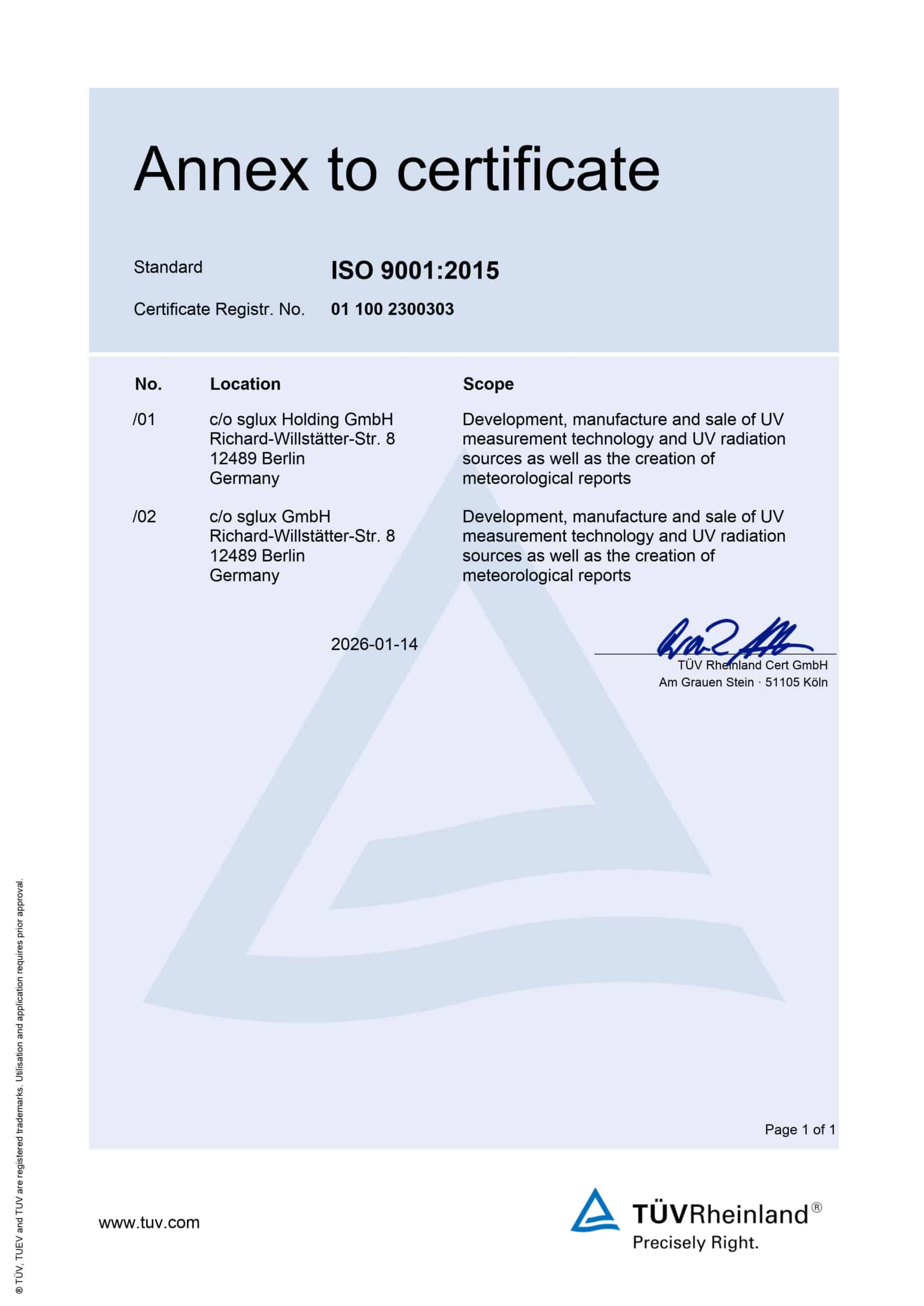 En el año 2003, un equipo de científicos y técnicos en el campo de desarrollo de semiconductores ópticos fundan sglux GmbH. Cooperando estrechamente con institutos de investigación y en sociedad con el cliente, su trabajo fue inspirado y conducido por la voluntad transferir la innovación científica al mercado de componentes de medición UV.
